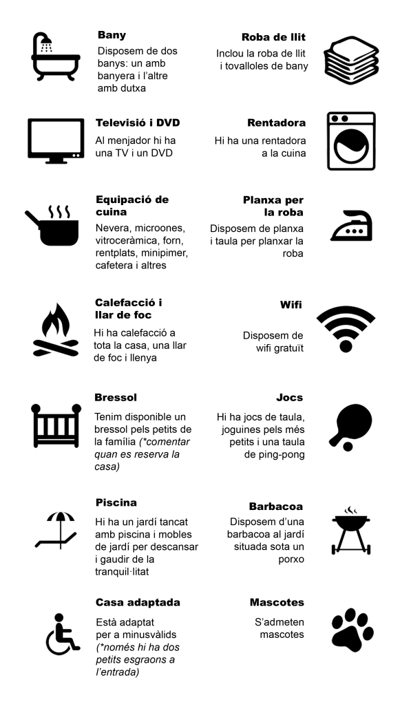 Can Pau és una casa independent que es lloga íntegrament i té una capacitat de 9 persones. La casa compta amb 4 habitacions (3 dobles i 1 triple) i dos lavabos complets. El menjador té una llar de foc, televisió i DVD. La cuina està totalment equipada amb rentaplats, rentadora, vitroceràmica, microones, nevera, etc. També disposa de calefacció a tota la casa. A l’exterior hi ha un jardí amb barbacoa i dutxa.